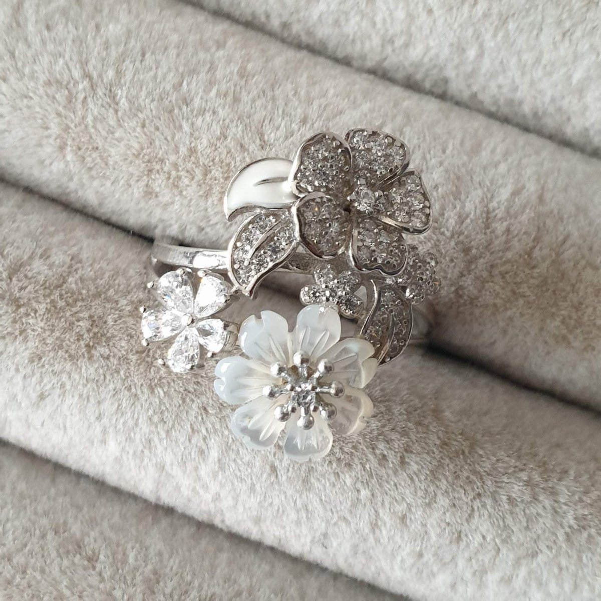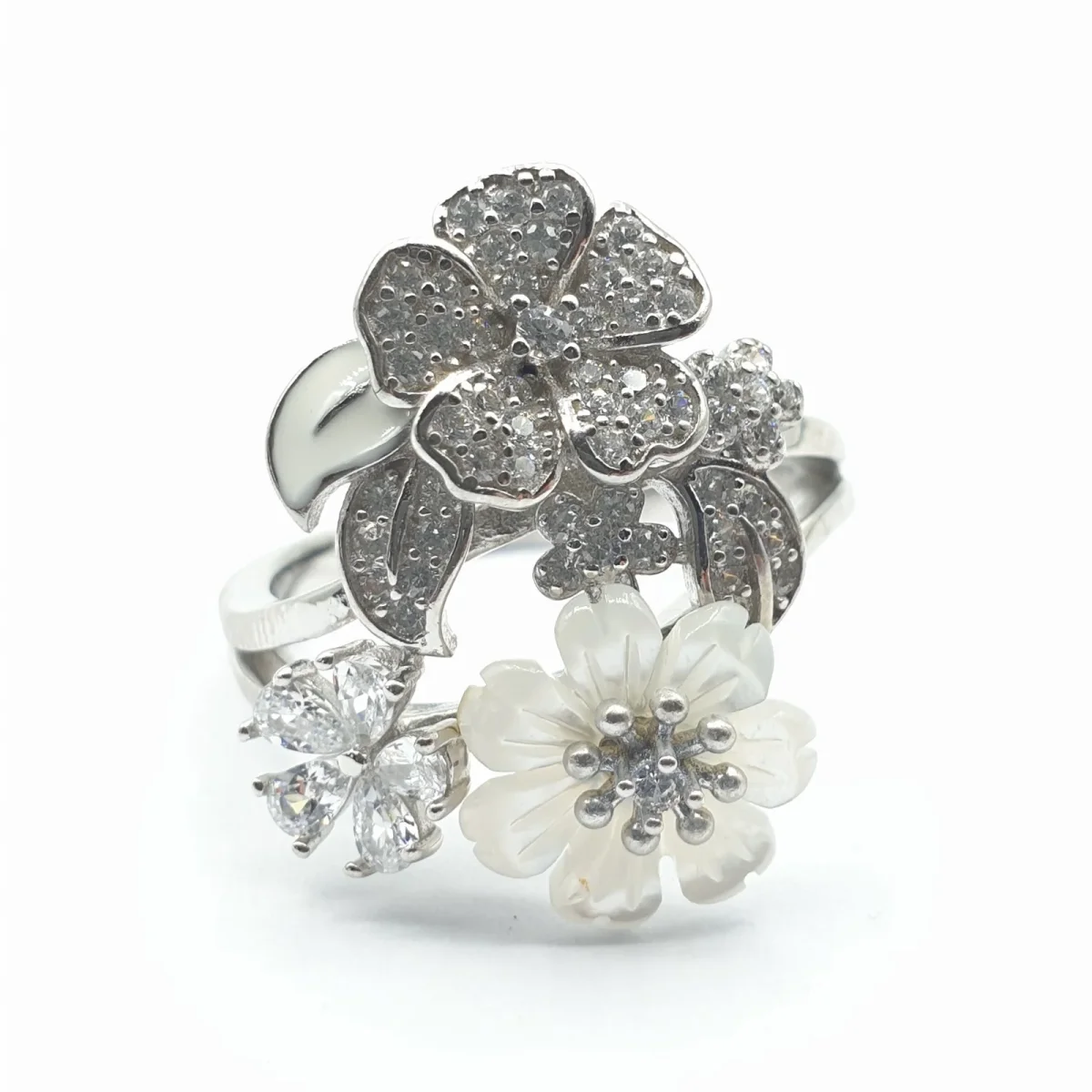 Bague Argent Rhodié garanti fleur de nacre fleur en amande